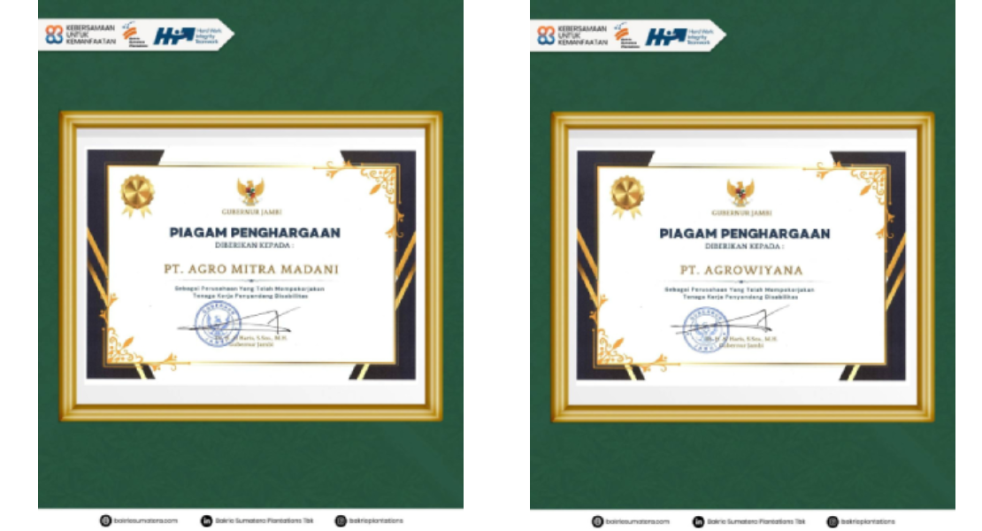 Jambi, 19 Januari 2026 - PT Agrowiyana (AGW) dan PT Agro Mitra Madani (AMM), dua unit bisnis PT Bakrie Sumatera Plantations Tbk mendapatkan penghargaan dari Gubernur Jambi, Dr. H. Al Haris, S.Sos., M.H. sebagai Perusahaan yang telah mempekerjakan tenaga kerja penyandang disabilitas. Penghargaan tersebut diserahkan dalam rangka Peringatan Bulan K3 Nasional Tahun 2026, pada Senin, 19 Januari 2026 bersama dengan 9 perusahaan lainnya di Provinsi Jambi.